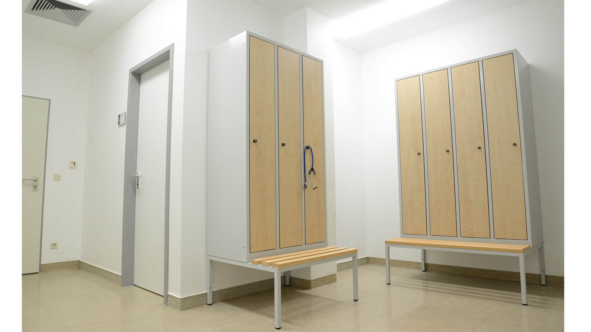 Die Durchgehenden Evolo Spinde mit Dekorfronten wurden in der Kombination Korpus Lichtgrau und Türen HPL Dekor Birke für den neuen Umkleidebereich geliefert.