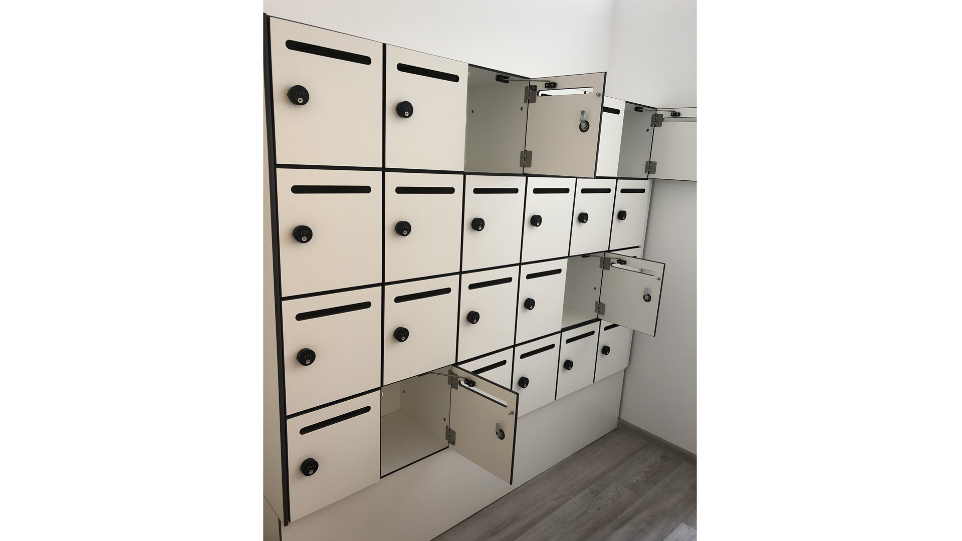 Die Schließfachschränke aus HPL-Material konnten wir individuell nach Wünschen und auf Maß für unseren Kunden fertigen. Mit den Briefeinwurfschlitzen ist es eine Erleichterung für die Mitarbeiter persönliche Briefe oder ähnliches für jeden einzelnen Mitarbeiter sicher und geschützt einzuwerfen. Mit der Schließung über das Zahlenschloss A170 ist der Aufwand der Schlüsselverwaltung hiermit auch ein Ende gesetzt. Des Weiteren ist die Handhabung der Schließung kinderleicht und sollte dennoch ein Code vergessen werden, gibt es hierzu einen Notöffnungsschlüssel mit dem man den Code wieder finden kann.